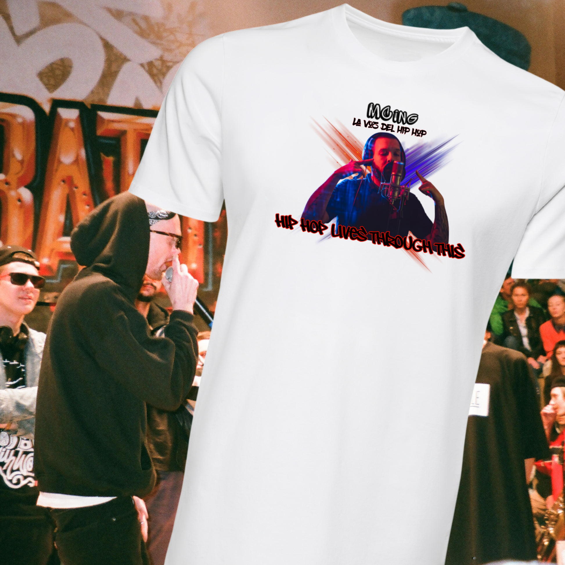 La palabra tiene poder. Esta camiseta celebra el MCing — la voz que narra, confronta y transforma. Hecha para los que viven y respiran barras.